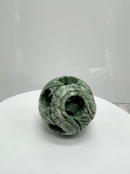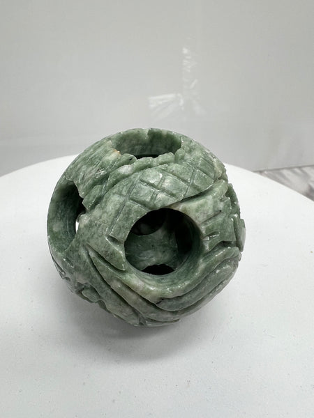 This 'puzzle ball' is a traditional Chinese decorative and Feng Shui item hand-carved from a single piece of jade with free-floating inner spheres, symbolizing family unity, prosperity, wisdom, and good fortune, often used for home decor or meditation.