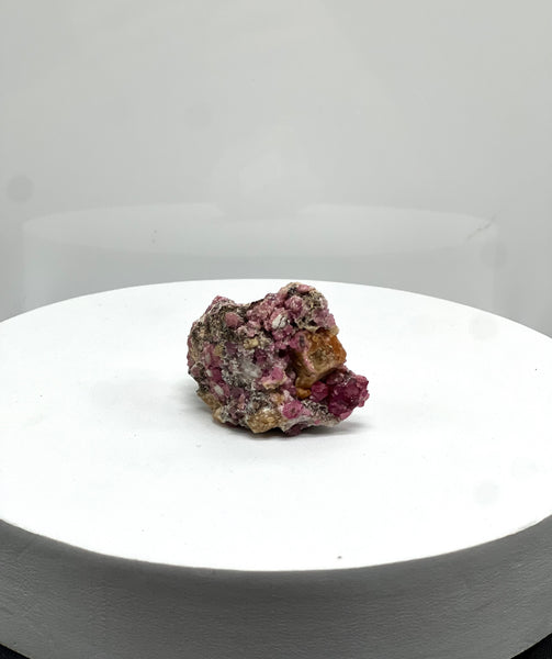 Raspberry grossular garnet forms primarily in skarn deposits, which are created by the contact metamorphism of impure limestone or other calcium-rich rocks. The distinctive raspberry-red or pink color is a result of trace amounts of manganese within the mineral's chemical structure.